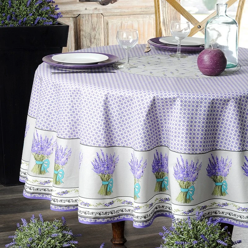 Krásný kulatý ubrus s bordurou s levandulemi. Tento ubrus rozsvítí váš interier, terasu, nebo zahradu. Je z kvalitní stálobarevné bavlny.