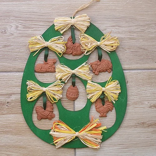Velké vejce na pověšení z překližky zelené barvy se zavěšenými keramickými ozdobami